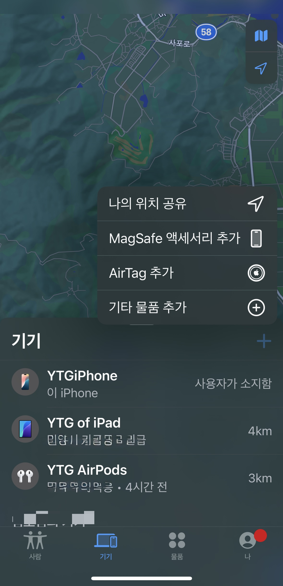 나의 아이폰 찾기 앱으로 들어가면 내가 위치한 곳에