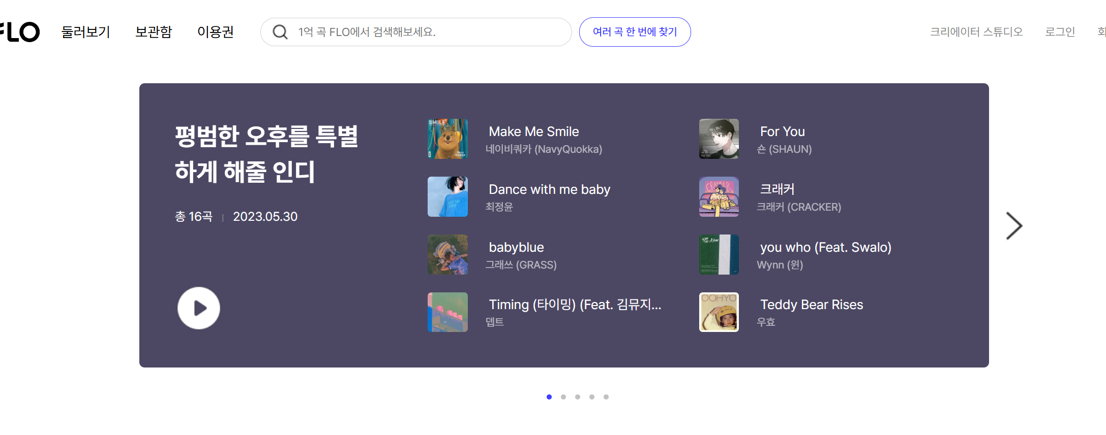 FLO는 '개인의 취향'에 맞춰주는 서비스라고 생각하시면 됩니다. 본인의 듣는 음악, '좋아요' 누른 곡, 심지어 '듣지 않을 곡' 설정까지 모든 데이터를 분석하여 AI가 당신에게 찰떡같이 맞는 플레이리스트와 홈 화면을 구성해줍니다. 맬론과 비슷한 믹스업이나 애들에서의 관련곡 스테이션기능이라고 보시면 됩니댜.