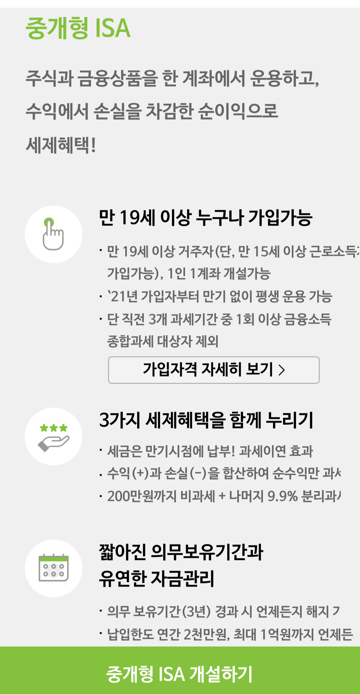 | ✅ 개설 가능 여부 | 1인 1계좌 원칙, 기존에 ISA 계좌가 있으면 이전 또는 해지 필요 |