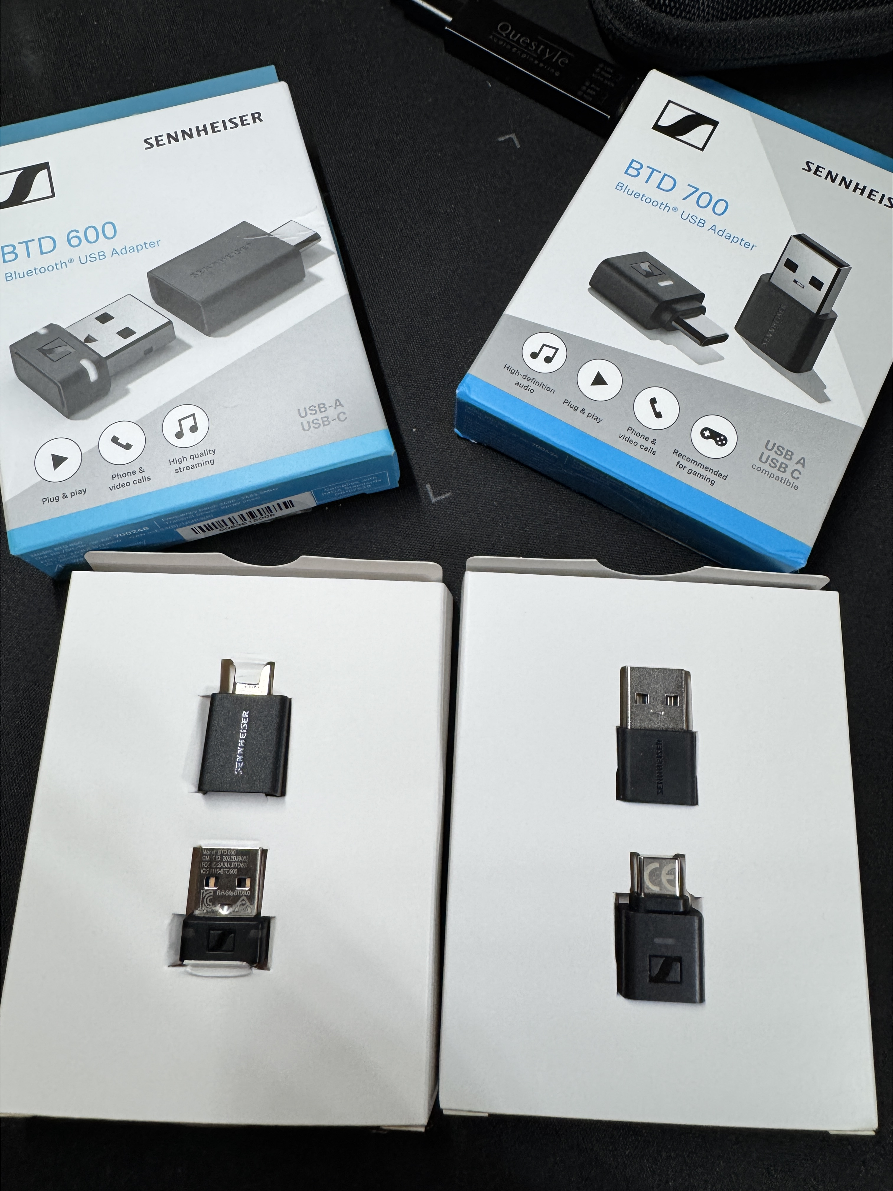- BTD 600: USB-A 기본, USB-C 젠더 포함 / 전용 앱 없음 단 젠하이저의 이어폰이나 해드폰의 연결을 해야 설정 가능