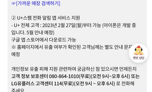 LG u플러스에서 최근에 디도스공격과 서버장애로 인해 많은 고객들이 불편을 겪고 있다는 뉴스가 보도된 적이 있었습니다. 그 당시 저도 u플러스고객센터앱에서 멤버십을 자주 사용하는 입장에서 그날따라 앱이 버벅거리는 현상이 자주 있었고 조금 불편을 느꼈습니다. 그리고 뉴스가 보도된 뒤 3일 뒤에 고객센터에 알림이 와서 확인해 보니 인터넷서버장애, 디도스공격피해로 개인정보 유출피해 지원이라는 문구와 함께 유심 무료교체라고 되어 있었습니다. 그래서 무료로 유심을 변경해 준다고 하길래 신청해 봤습니다.