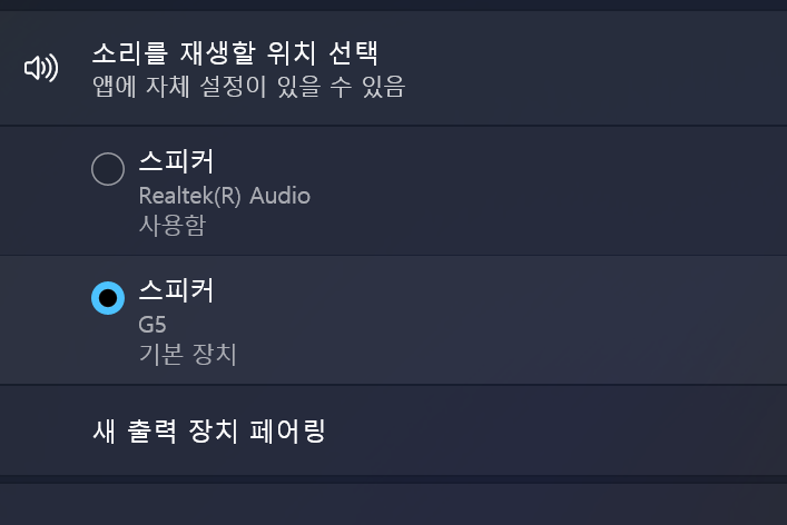 그리고 잘 인식되었는지 아래 작업 표시줄에 있는 소리모양을 클릭하여 g5라고 나와 있는지 확인가능하며 설정에 들어가서 소리 들어가시면 현재 연결된 기기가 나타납니다. (맥북은 소리설정을 클릭하여 확인할 수 있습니다. )