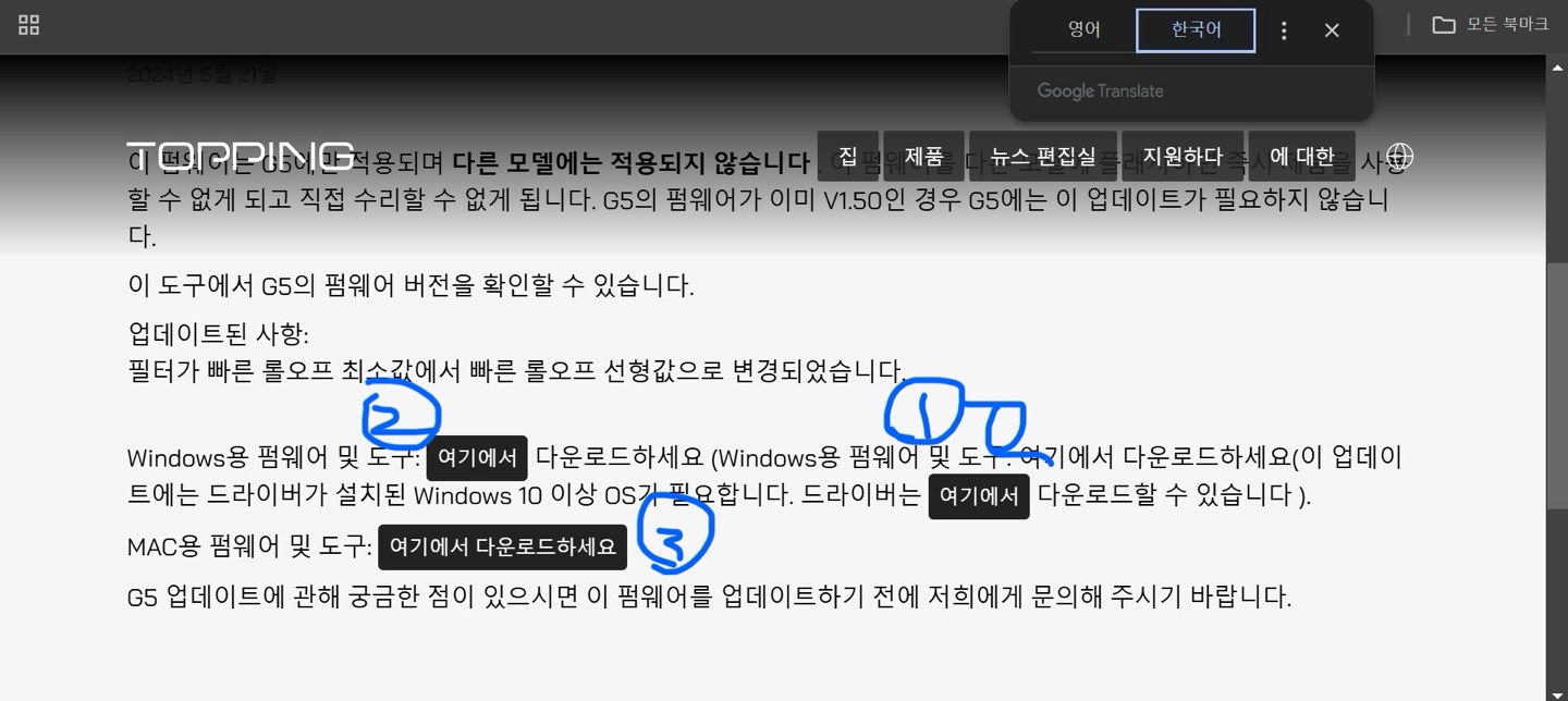 1. 토핑 사이트나 구글에 한글로 토핑 G5업데이트하고 검색하면 사이트가 나옵니다. (제가 걸어둔 링크로 들어가도 됩니다.) https://www.toppingaudio.com/download/g5-version-v1-50-firmware-update