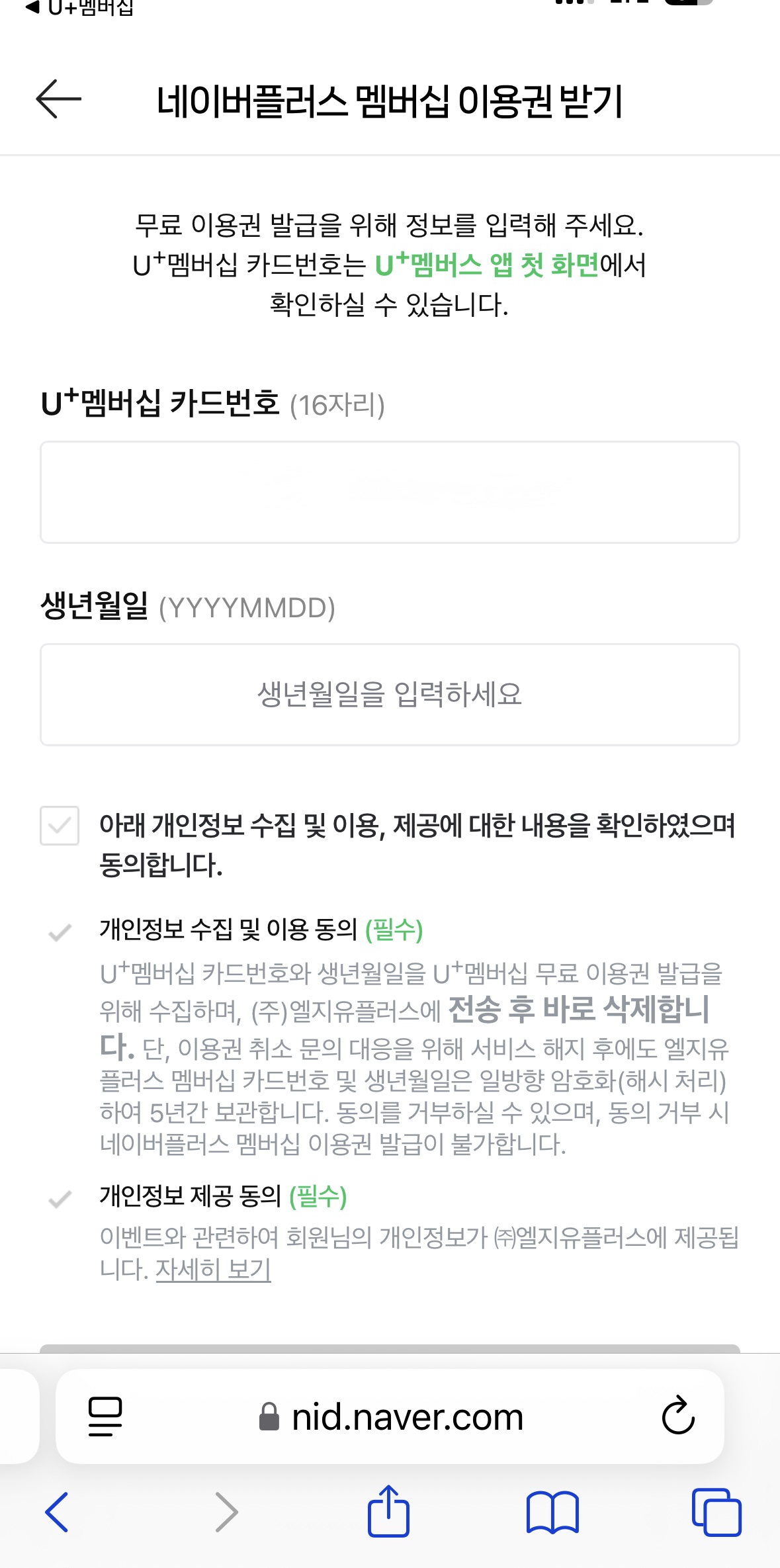 네이버 아이디 연동 후 밑의 사진 처럼 이용권 사용하기 위한 유플러스 카드번호를 넣어주세요.